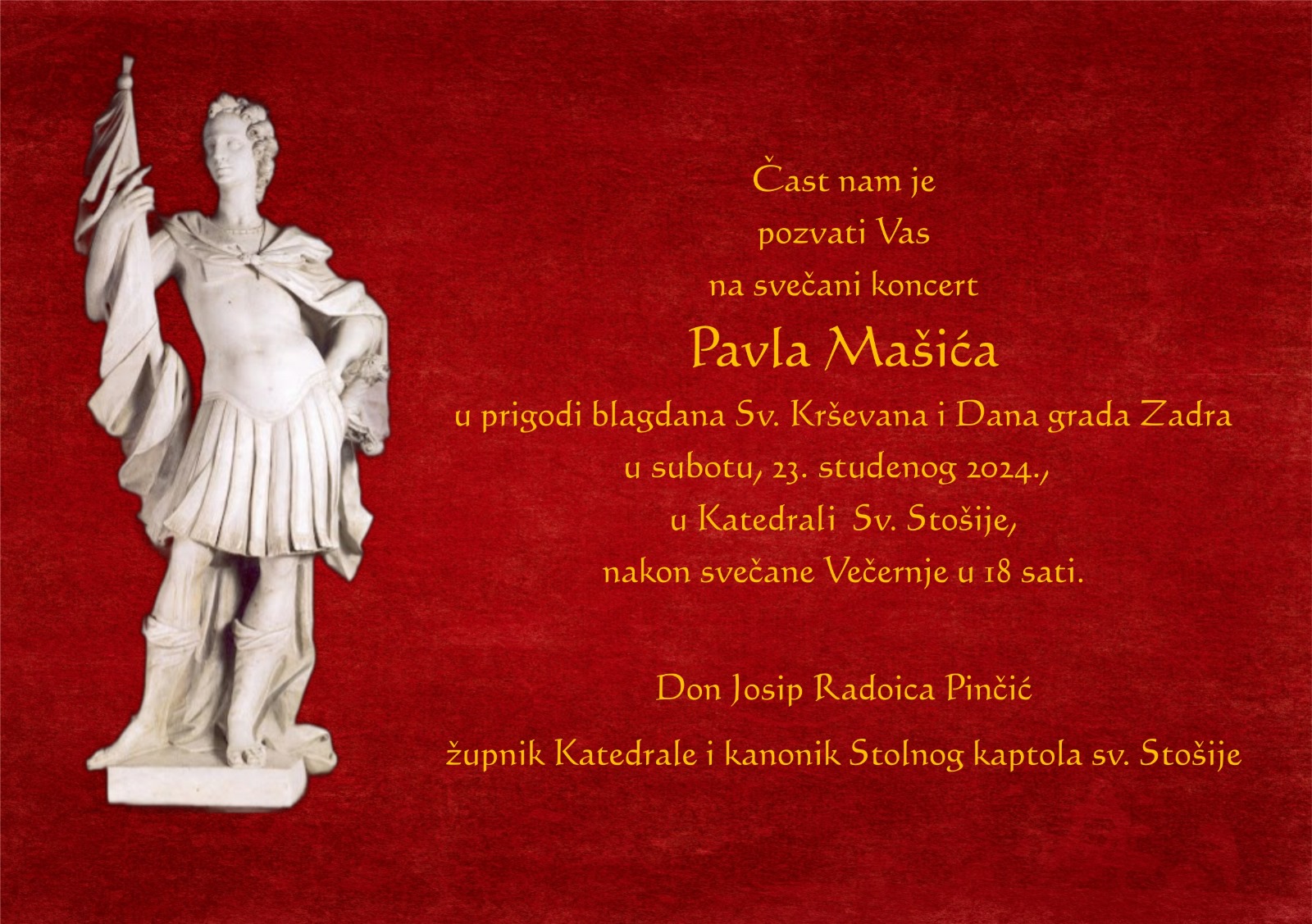 24. studenog 2024. godine će se održati svečana sv. misa s početkom u 18:00 sati koju predvodi mons. Milan Zgrablić, nadbiskup zadarski.