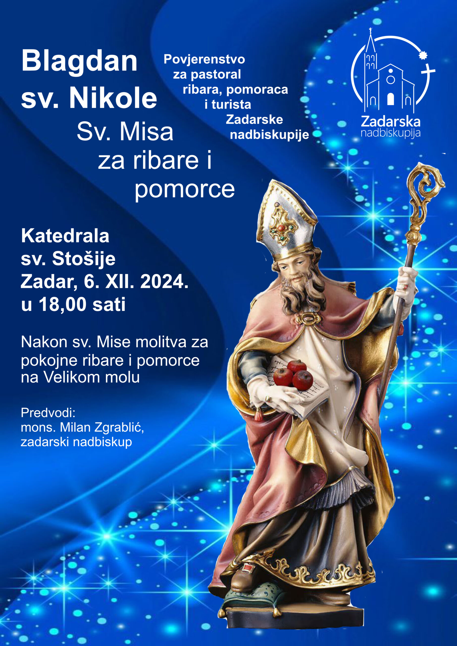 Na blagdan sv. Nikole, zaštitnika pomoraca, u petak, 6. prosinca, svečano misno slavlje u katedrali sv. Stošije u Zadru u 18 sati predvodi zadarski nadbiskup Milan Zgrablić.