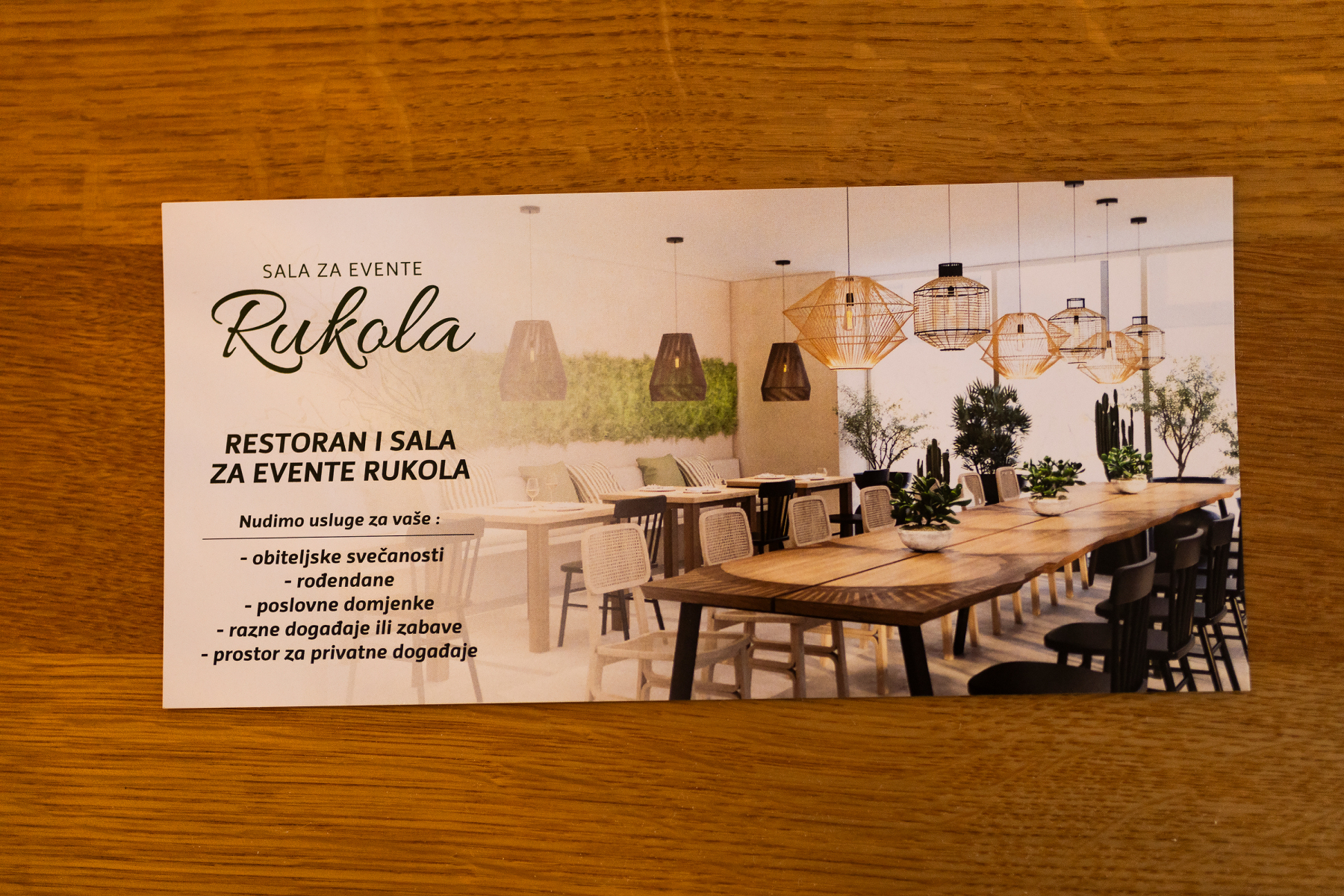 Vaši rođendani, sakramenti, privatne ili poslovne zabave od sada mogu biti održani u prekrasnom ugodnom ambijentu Rukole. Svi gosti uživat će u gastronomskim delicijama pripremljenima od domaćih proizvoda, vrhunskim koktelima i opuštenoj atmosferi. Osim toga, Rukola nudi i uslugu cateringa.