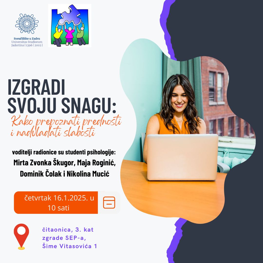 Studentsko savjetovalište u suradnji sa studentima prve godine diplomskog studija na Odjelu za psihologiju poziva Vas na radionicu iz područja psihologije rada pod nazivom „Izgradi svoju snagu: Kako prepoznati prednosti i prevladati slabosti” koja će se održati u četvrtak 16. siječnja 2025. u 10 sati u prostoru čitaonice na 3. katu zgrade SEP-a na adresi Šime Vitasovića 1.