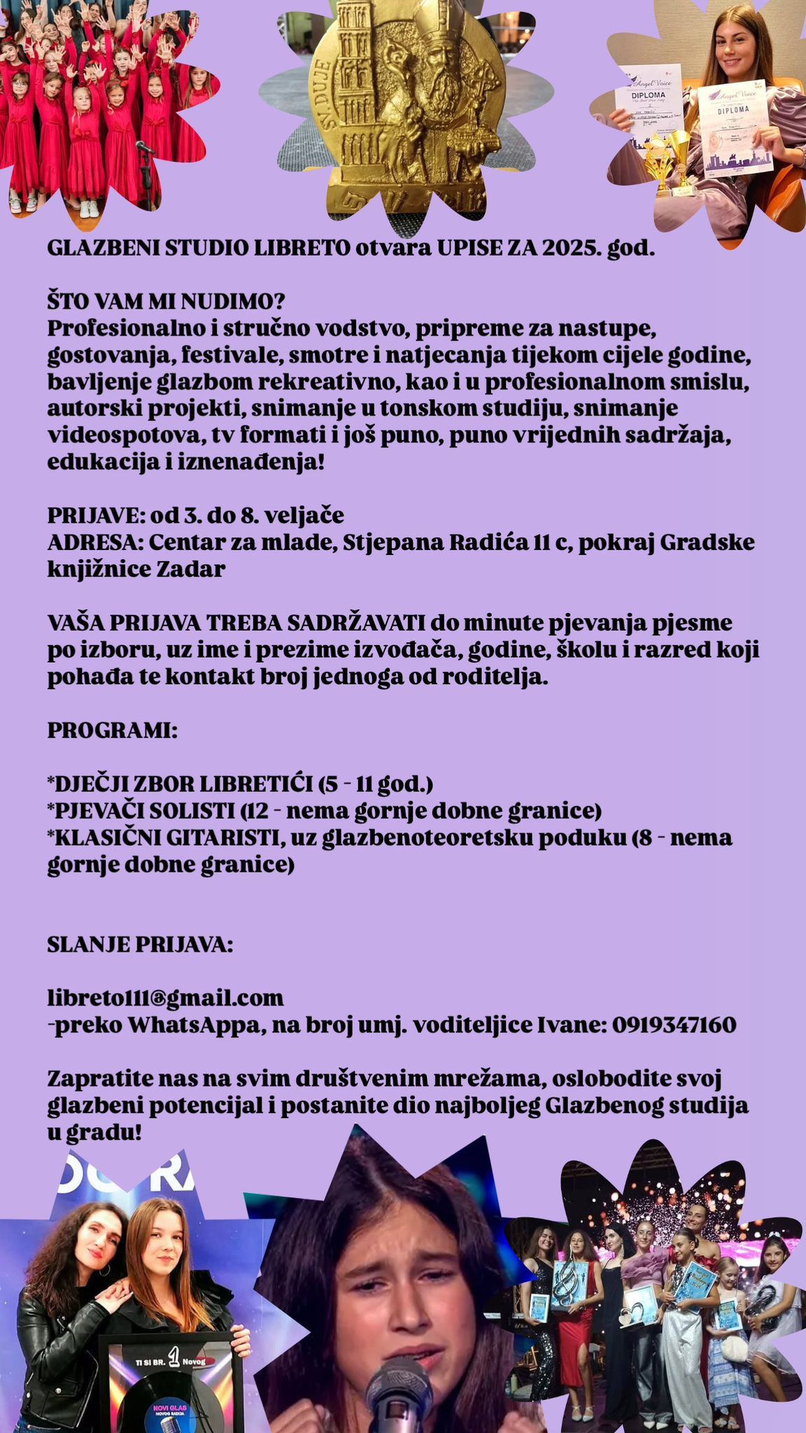 Ako želite biti dio Glazbenoga studija u gradu koji ima nadaleko poznate i priznate rezultate, u kojemu se puno radi, vježba, snima, putuje, u kojemu se osvajaju nagrade i upušta u brojne pustolovine, ali se isto tako njeguje kvalitetna i profesionalna edukacija te se s učenicima radi duboko, predano i posvećeno, uz puno nježnosti, prihvaćanja, ljubavi i topline – onda je LIBRETO pravo mjesto za vas!