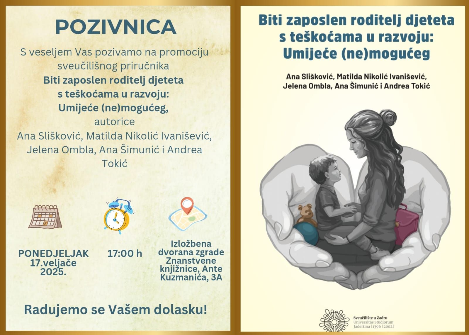 U ponedjeljak, 17. veljače s početkom u 17.00 sati održat će se promocija sveučilišnog priručnika “Biti zaposlen roditelj djeteta s teškoćama u razvoju: Umijeće (ne)mogućeg”.