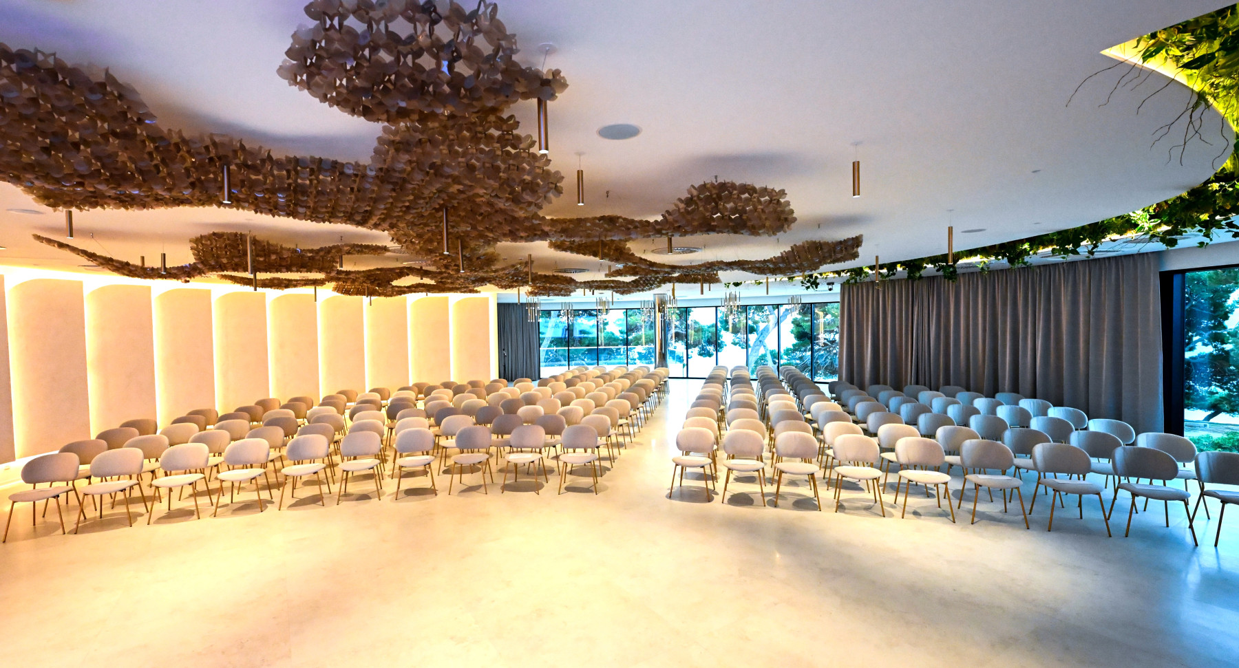 Centar se ističe inovativnim kružnim dizajnom koji izlazi iz okvira standardne kongresne ponude, spajajući modernu arhitekturu s prirodnim ljepotama. Smješten u stoljetnoj borovoj šumi, uz obalu kristalno čistog mora, pruža inspirativno okruženje koje savršeno spaja poslovni luksuz i opuštajuću atmosferu. Centar obuhvaća dvije multifunkcionalne dvorane sa suvremenom tehnologijom te Restaurant & Beach club u prizemlju, dok staklene stijene na prvom katu pružaju spektakularan pogled na more i otoke.