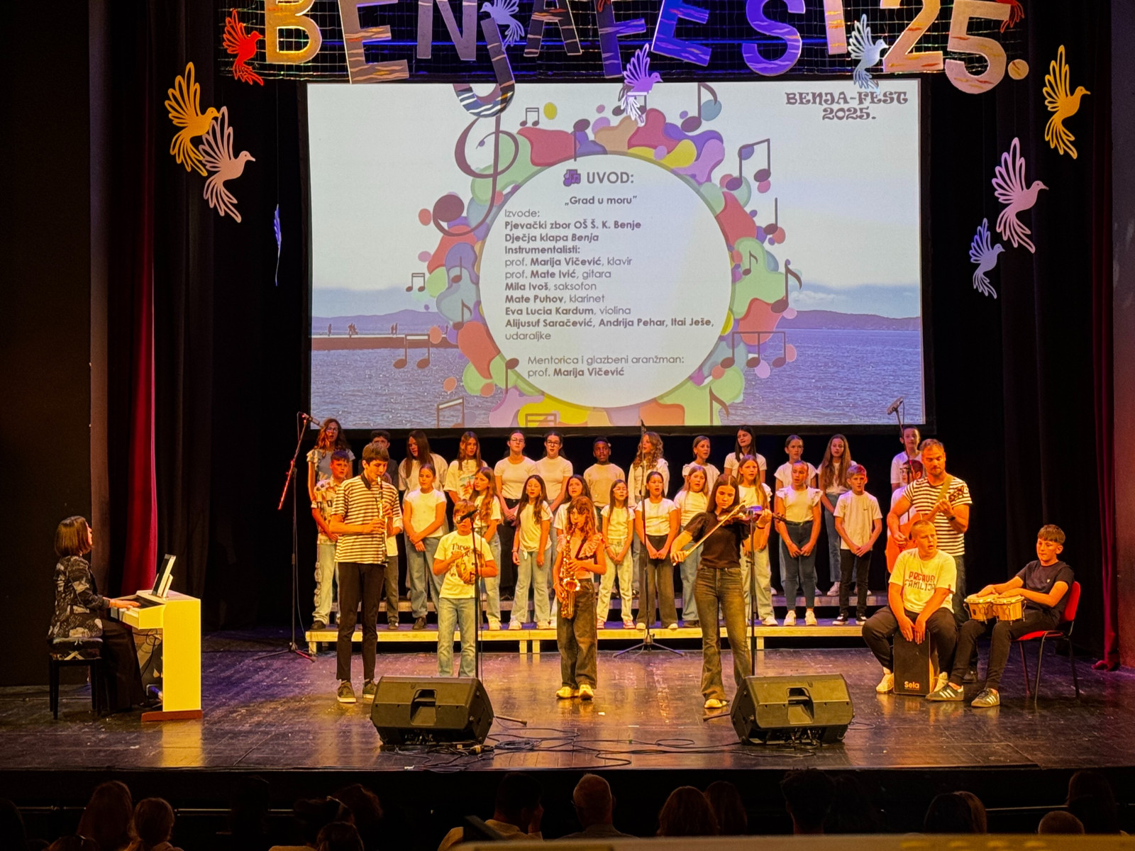 Festival je započeo dojmljivom izvedbom pjesme „Grad u moru” (Damir Košpić), koju je u potpunosti osmislila i glazbeno oblikovala profesorica Marija Vičević. Autorica koncepta uvodne točke okupila je školski zbor, dječju klapu Benja, učenike instrumentaliste te kolege prof. Mate Ivića (gitara) i uz vlastiti doprinos klavirskom pratnjom, čime je oblikovala snažan glazbeni trenutak u kojem se jasno osjetio duh suradnje i umjetničke posvećenosti. Skladna povezanost djece i nastavnika na pozornici i emotivna izvedba izazvali su oduševljenje publike, koju su činili brojni učenici škole, roditelji, rodbina i uzvanici. Gromoglasan pljesak i ovacije nakon uvodne točke bili su jasan znak da je festival započeo – ne samo s pjesmom, već s porukom: ova škola živi glazbu.