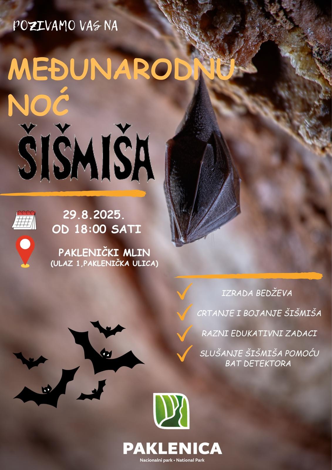 Iz Nacionalnog parka Paklenica poziv na Međunarodnu noć šišmiša koja se održava u petak, 29. kolovoza 2025. u 18:00 h, u Nacionalnom parku kod Pakleničkog mlina.
