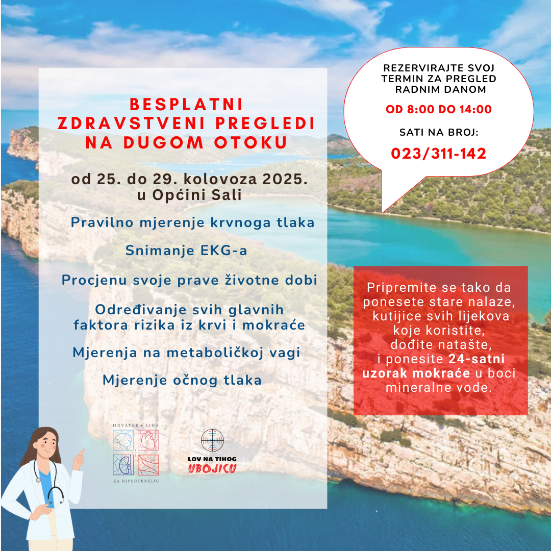 Ova jedinstvena javnozdravstvena akcija “Lov na tihog ubojicu” održat će se od 25. do 29. kolovoza 2025. u prostorima Općine Sali (Sali II 74/A).
