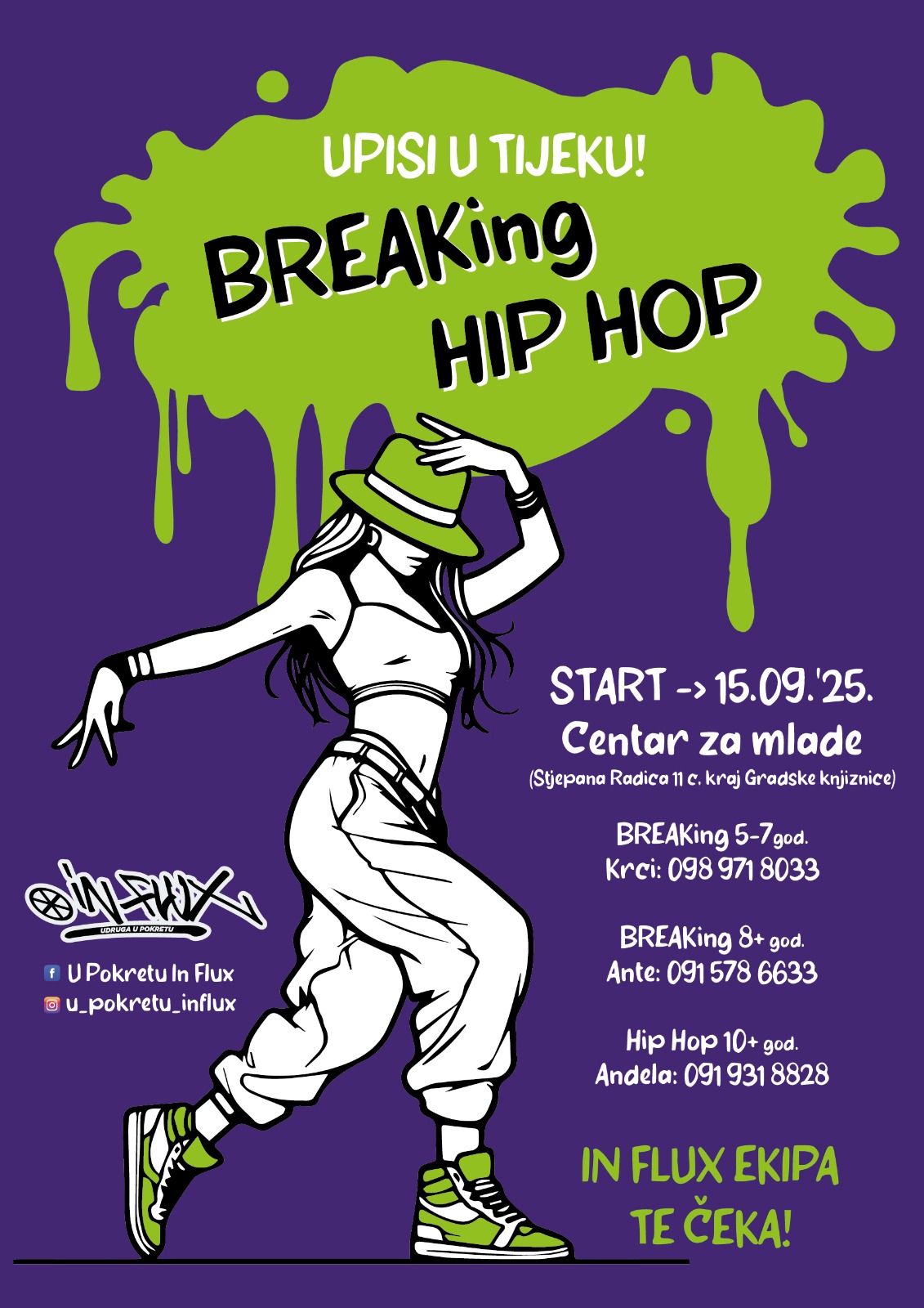 Udruga U Pokretu, poznata i pod imenom In Flux, vrši upise za tečajeve urbanih plesnih stilova koji će se održavati u nadolazećoj školskoj godini u Centru za mlade Zadar. Dostupni programi su Hip Hop za uzrast od 10 godina i starije, Breaking za mlađi uzrast od 5 do 7 godina te Breaking za uzrast od 8 godina i starije.