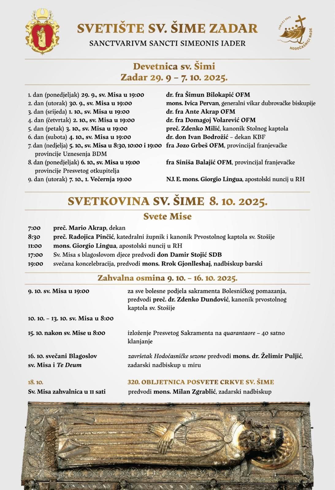 Na svetkovinu sv. Šime, zaštitnika Zadra čijem se zagovoru utječe puk iz cijele Zadarske nadbiskupije, u srijedu, 8. listopada, svečano misno slavlje u 11 sati predvodi mons. Giorgio Lingua, apostolski nuncij u Hrvatskoj.