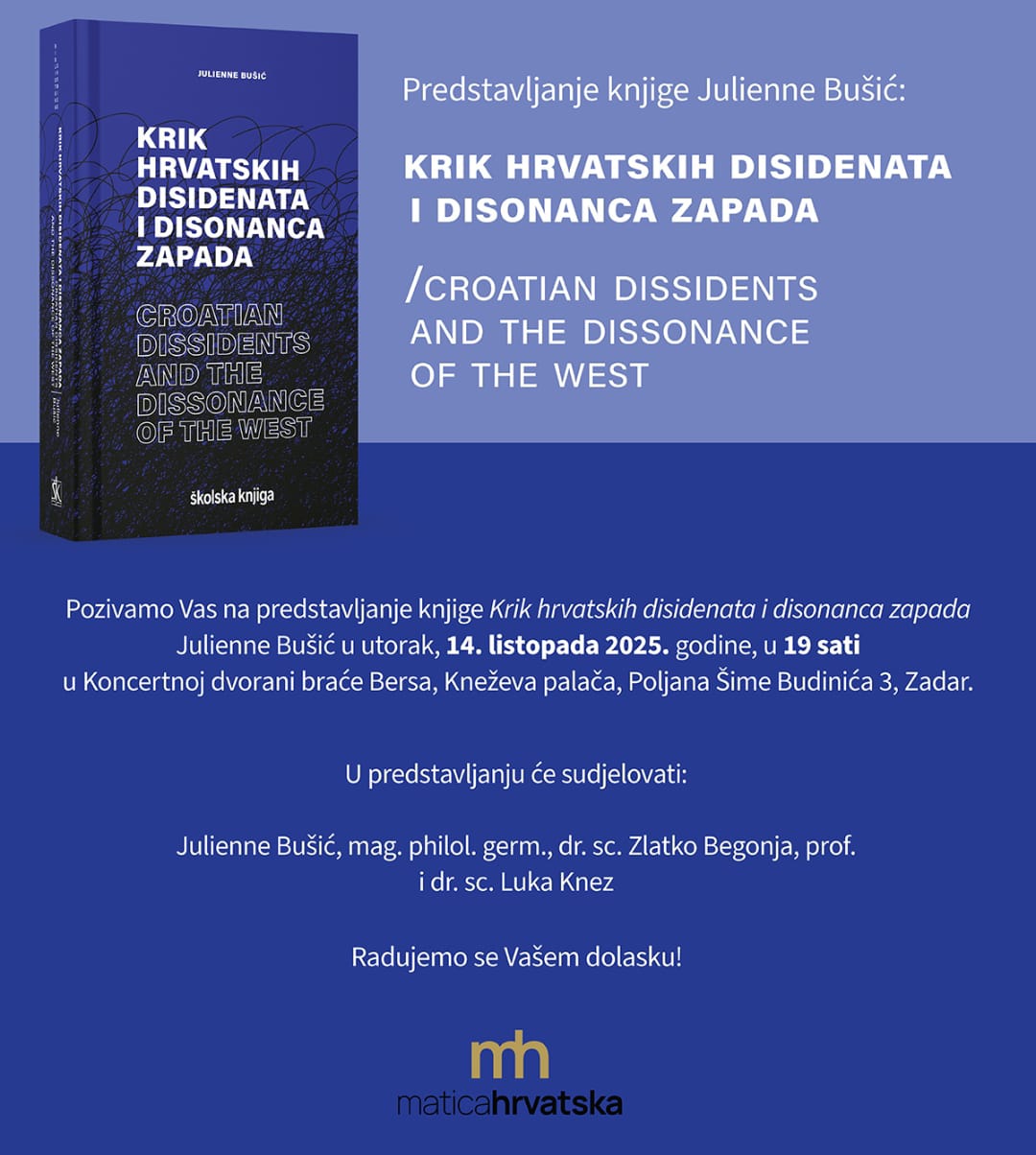Ogranak Matice hrvatske u Zadru predstavlja knjigu Julienne Bušić: Krik hrvatskih disidenata i disonanca Zapada / Croatian Dissidents and the Dissonance of the West.