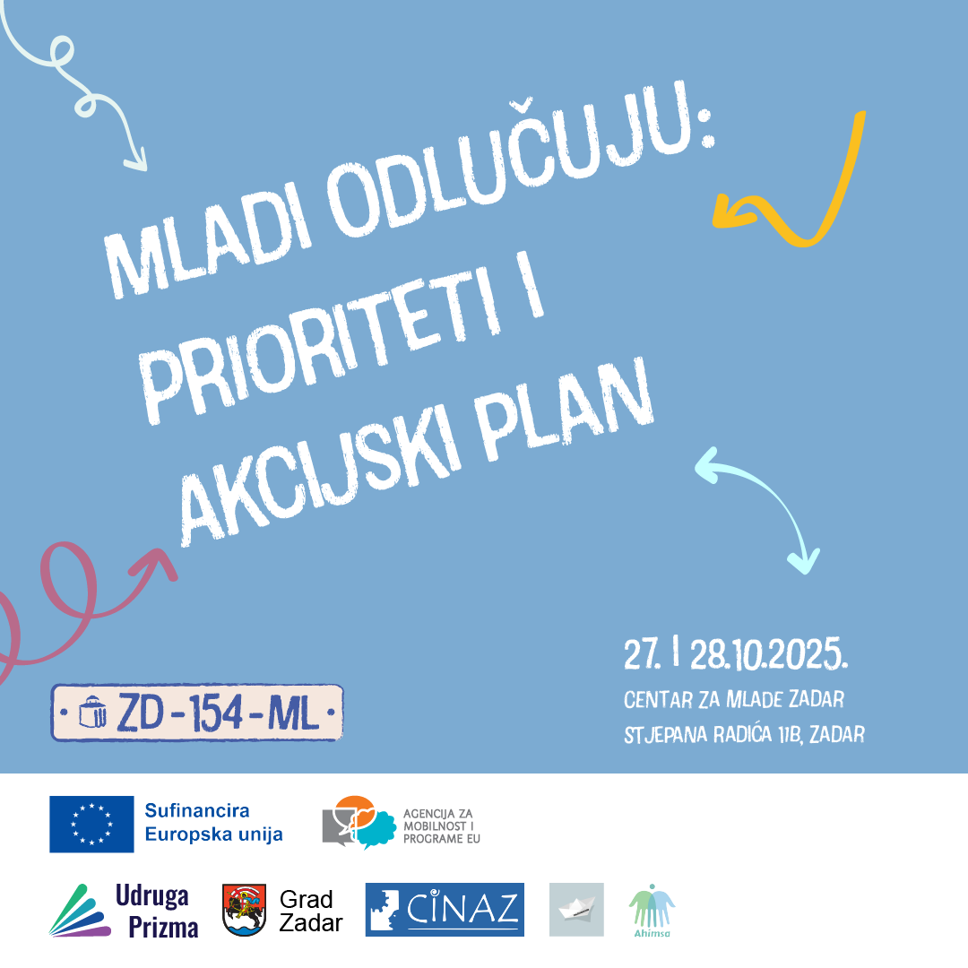 Događanje s mladima pod nazivom Mladi odlučuju: Prioriteti i akcijski plan održava se u okviru projekta ZD-154-ML 27. i 28. listopada 2025. godine s početkom u 09:00 sati u dvorani Mala scena u Centru za mlade Zadar, na adresi Stjepana Radića 11c, Zadar.