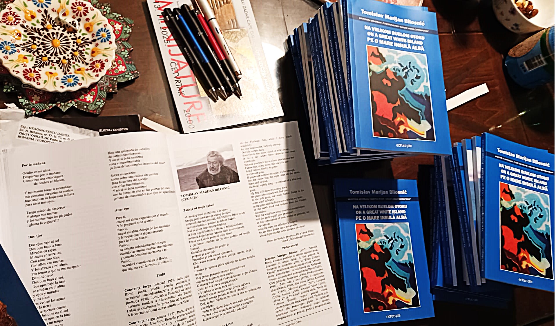 Sredinom studenoga 2025. godine iz tiska je, u izdanju rumunjske kuće Editura Pim, u sklopu Biblioteci Universalis Colectiile Revistei višejezičnoga časopisa Orizont Literar Contemporan u Bukureštu i Iaşiju, izišla nova zbirka pjesama istaknutog hrvatskog književnika Tomislava Marijana Bilosnića – „Na velikom bijelom otoku“ / „On a Great White Island“ / „Pe o mare insulă albă“. Riječ je o reprezentativnom trojezičnom izdanju, tiskanom na rumunjskom, engleskom i hrvatskom jeziku, koje na 132 stranice objedinjuje pjesnički i likovni segment autorova stvaralaštva.
