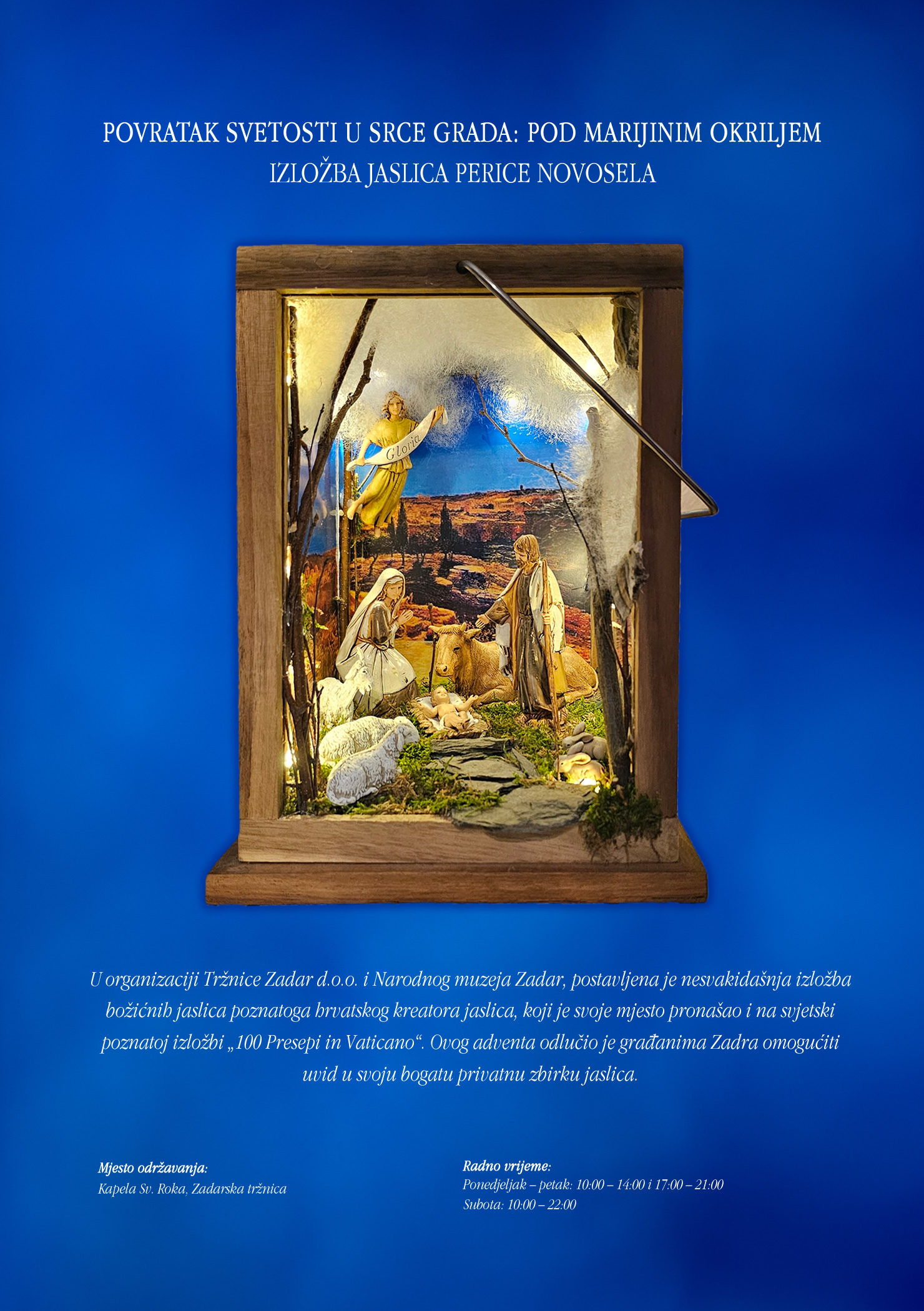 U organizaciji Tržnice Zadar d.o.o. i Narodnog muzeja Zadar, postavljena je nesvakidašnja izložba božićnih jaslica poznatoga hrvatskog kreatora jaslica, koji je svoje mjesto pronašao i na svjetski poznatoj izložbi „100 Presepi in Vaticano“.