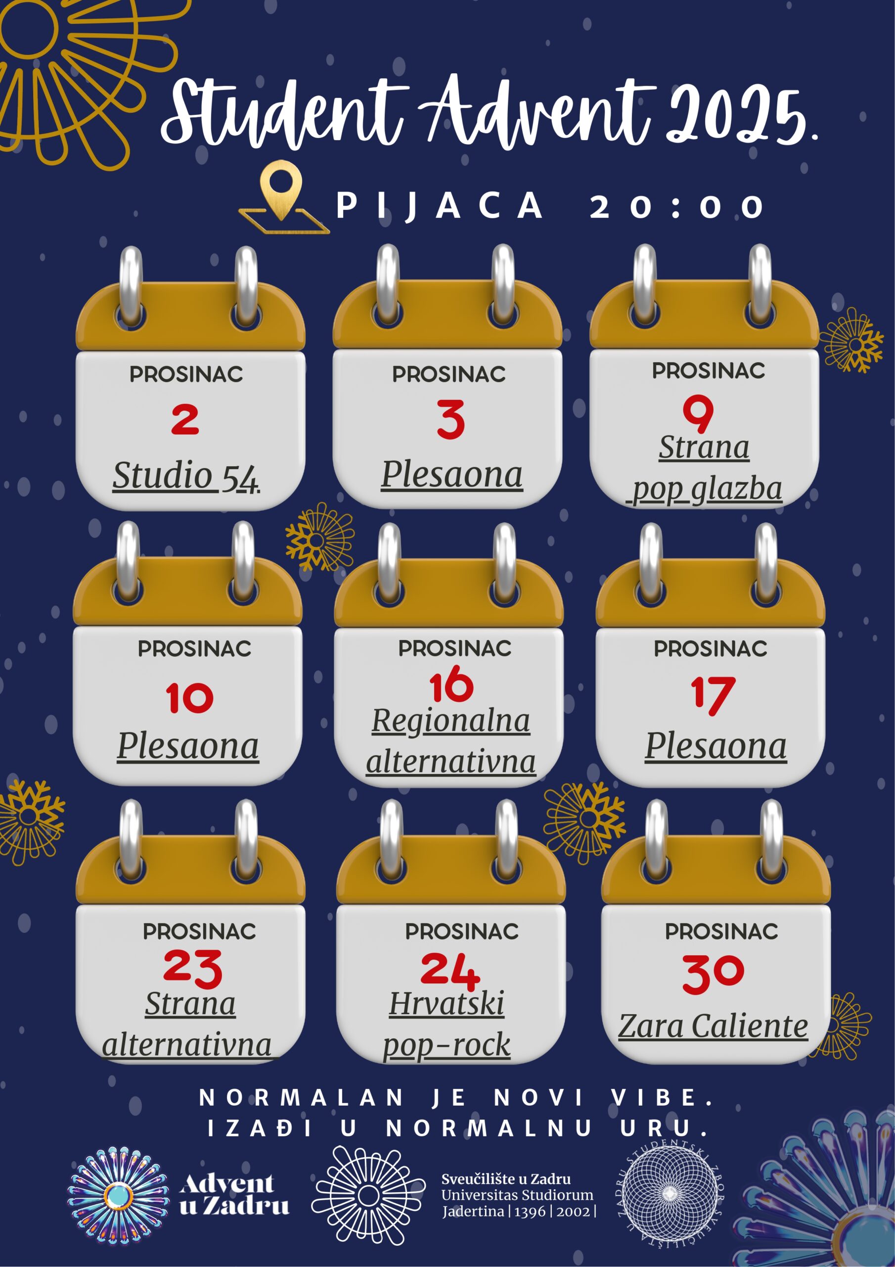 Utorci i srijede rezervirani su za Student Advent, namijenjen studentima, profesorima, djelatnicima i svima koji žele uživati u glazbi koju rijetko mogu čuti u današnjim klubovima.