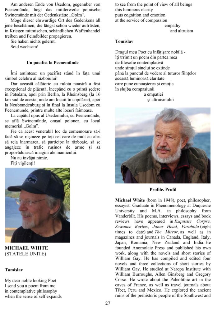 U rumunjskom međunarodnom, višejezičnom časopisu Orizoint Literar Contemšporan, br. 5 (109), rujan – listopad 2025., koji izlazi u Bukureštu, a uređuje poznati rumunjski književnik Daniel Dragomirescu, na 27. stranici časopisa, tiskana je pjesma američkog pjesnika, filozofa i esejista Michaela Whitea (1948.), pod naslovom „Tomislav“.