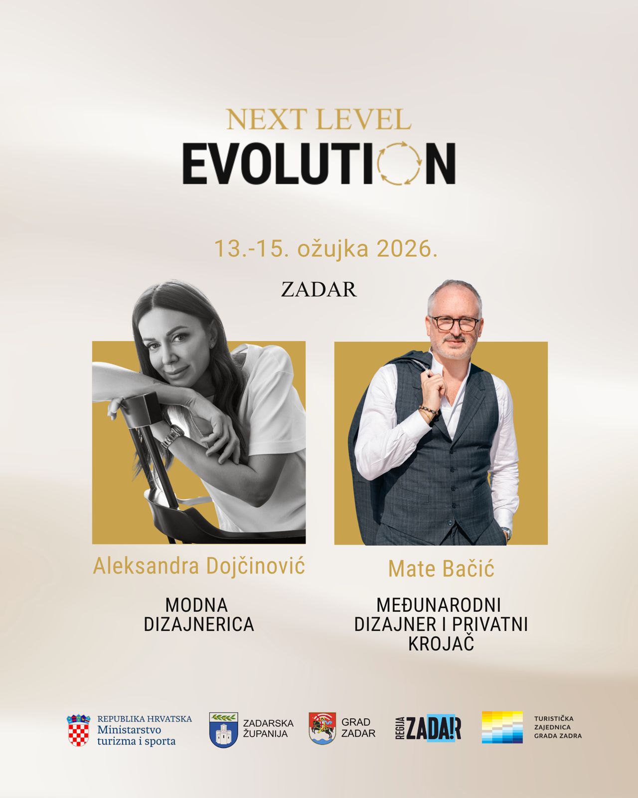 Sudjelovanje Aleksandre Dojčinović i Mateja Bačića dodatno potvrđuje modni segment manifestacije kao prostor inspiracije, razmjene iskustava i jasne poruke, a to je da je moguće iz lokalnog konteksta stvarati projekte svjetske razine, bez gubitka identiteta i autentičnosti. Događaj se održava pod pokroviteljstvom Ministarstva turizma i sporta, Zadarske županije, Grada Zadra te Turističkih zajednica Zadarske županije i Grada Zadra. Prijave za sudjelovanje otvorene su na: https://www.evolution-nextlevel.com/