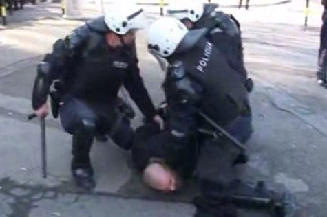 Policija suzavcem pokušava rastjerati demonstrante. Izgrednici gađaju policiju kamenjem, vičući: “Idite na Kosovo”.