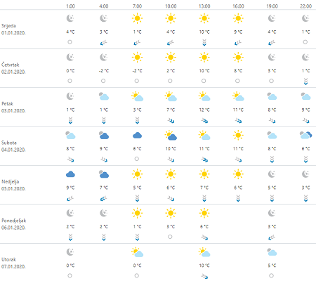 U četvrtak sunčano, u unutrašnjosti ujutro s maglom koja se ponegdje može zadržati i veći dio prijepodneva. Vjetar većinom slab, dok će na Jadranu, nakon umjerene i jake bure, danju puhati umjeren sjeverozapadnjak. Najniža temperatura zraka od -6 do -1, na Jadranu od 4 do 8 °C. Najviša između 3 i 7 u unutrašnjosti te 10 i 15 °C na Jadranu.