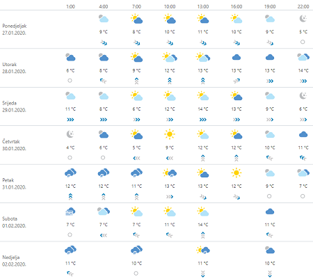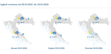 U utorak umjereno do pretežno oblačno i vjetrovito. Kiše će biti u noći i ujutro na sjevernom Jadranu i u gorju, a potom i drugdje. Na Jadranu će lokalno biti i pljuskova s grmljavinom, a krajem dana uz zahladnjenje u višim predjelima ponegdje je moguć i snijeg. Puhat će umjeren do jak, u gorju i na sjevernom Jadranu mjestimice i olujan jugozapadnjak, a u Dalmaciji jako jugo. Minimalna temperatura zraka od 0 do 4, na Jadranu od 6 do 11, a maksimalna uglavnom od 11 do 15, u gorju malo niža.