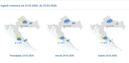 Promjenljivo, od utorka na kopnu i pretežno oblačno uz povremenu oborinu. Padat će uglavnom snijeg, u Dalmaciji i kiša. Oborina će biti češća od utorka, a u ponajprije u unutrašnjosti nastat će snježni pokrivač, osobito u gorju. Puhat će umjeren do jak, prolazno i vrlo jak sjeverni i sjeveroistočni vjetar. Na Jadranu umjerena i jaka bura s olujnim, podno Velebita i orkanskim udarima. Vjetar će u srijedu oslabjeti. Osjetno hladnije.