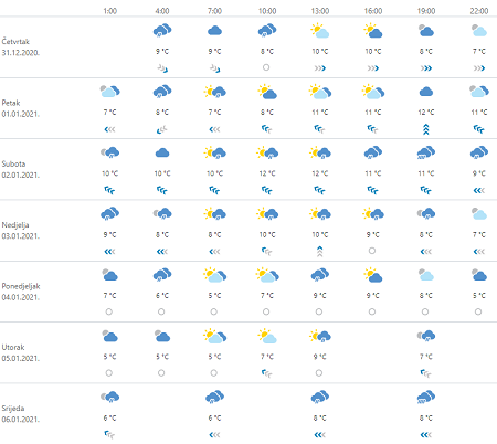 Prvog dana nove godine na Jadranu i uz njega promjenljivo oblačno povremenu uz kišu i to uglavnom na sjevernom Jadranu, dok će u gorju pasti i malo snijega. Prema večeri kiša će se proširiti i na Dalmaciju. U sjevernim kopnenim krajevima djelomice sunčano, a ujutro i prijepodne mjestimice magla ili niski oblaci. Vjetar slab do umjeren južni i jugozapadni, a na Jadranu će jačati jugo. Najniža jutarnja temperatura zraka od -3 do 1, a na Jadranu od 5 do 9 °C. Najviša dnevna uglavnom između 5 i 9, a na Jadranu 11 i 14 °C.
