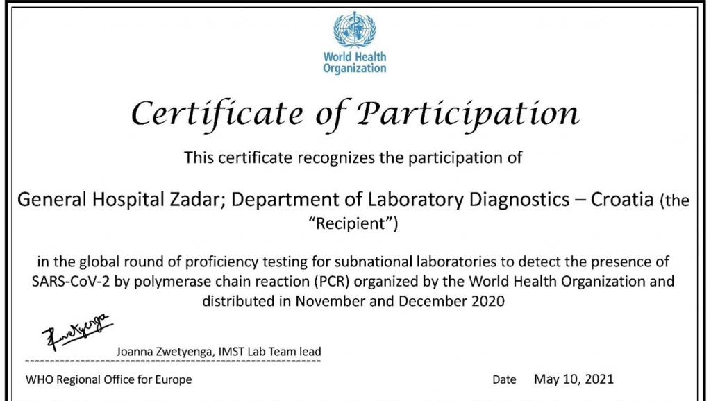 Na temelju rezultata i sudjelovanja Općoj bolnici Zadar 16. kolovoza 2021. dostavljeni su rezultati i certifikat Svjetske zdravstvene organizacije WTO-a.