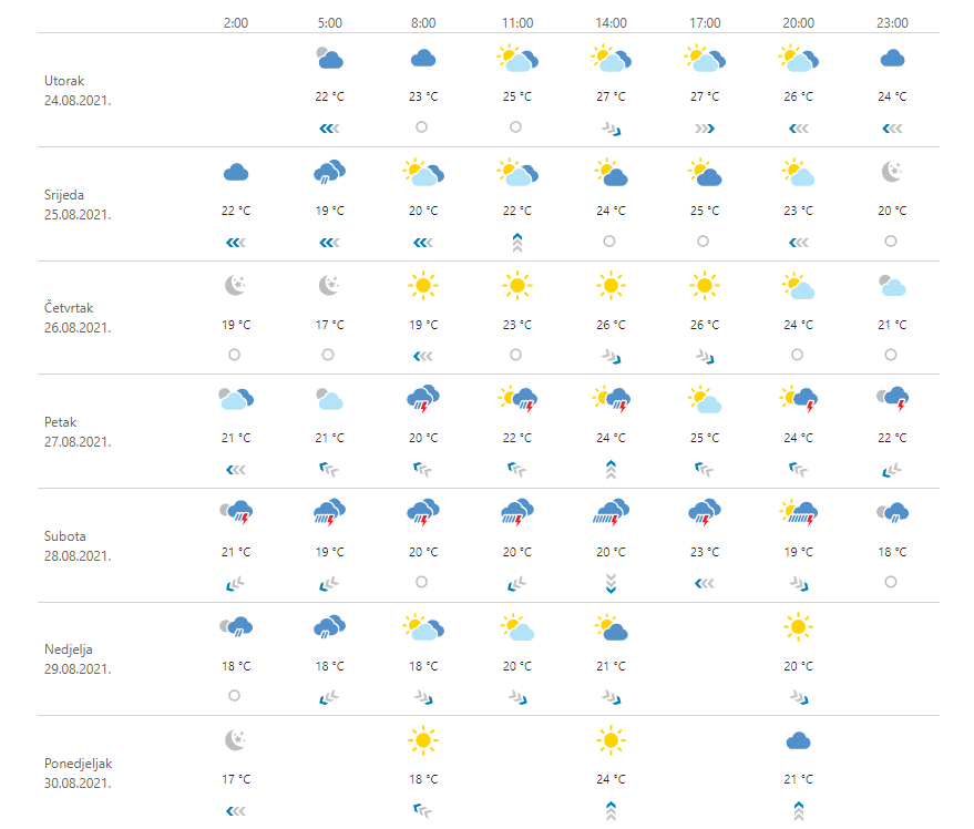 U srijedu promjenljivo oblačno sa sunčanim razdobljima i nestabilno. Mjestimice će biti kiše, ponajprije u Dalmaciji i lokalnih pljuskova praćenih grmljavinom. Najsunčanije i bez oborine u Istri. Vjetar slab do umjeren sjeverni i sjeveroistočni, na istoku i sjeverozapadni. Na Jadranu umjerena do jaka bura, pod Velebitom i s olujnim udarima, prema otvorenom moru i sjeverozapadnjak. Najniža temperatura od 12 do 17, na Jadranu između 18 i 22 °C. Najviša dnevna od 18 do 23 na kopnu te između 25 i 29 °C na Jadranu i u unutrašnjosti Dalmacije.