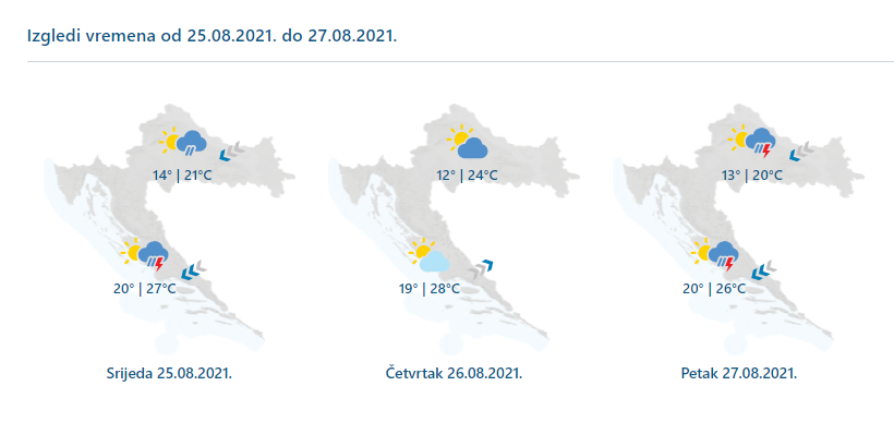 U srijedu promjenljivo oblačno sa sunčanim razdobljima i nestabilno. Mjestimice će biti kiše, ponajprije u Dalmaciji i lokalnih pljuskova praćenih grmljavinom. Najsunčanije i bez oborine u Istri. Vjetar slab do umjeren sjeverni i sjeveroistočni, na istoku i sjeverozapadni. Na Jadranu umjerena do jaka bura, pod Velebitom i s olujnim udarima, prema otvorenom moru i sjeverozapadnjak. Najniža temperatura od 12 do 17, na Jadranu između 18 i 22 °C. Najviša dnevna od 18 do 23 na kopnu te između 25 i 29 °C na Jadranu i u unutrašnjosti Dalmacije.