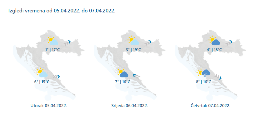 Danas djelomice sunčano ponegdje uz promjenjivu naoblaku. Lokalno malo kiše može pasti na Jadranu, uglavnom na jugu Dalmacije gdje će biti i grmljavine. Vjetar uglavnom slab do umjeren jugozapadni i južni, na Jadranu slabo do umjereno jugo i jugozapadnjak. Najviša temperatura uglavnom od 8 do 12, a na Jadranu između 13 i 15 °C.