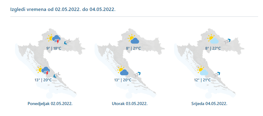 U unutrašnjosti u ponedjeljak umjereno do pretežno oblačno, mjestimice s kišom ili pljuskovima i grmljavinom. Zatim djelomice ili pretežno sunčano. Vjetar uglavnom slab. U ponedjeljak tek malo svježije, a zatim ugodno toplo. Na Jadranu u ponedjeljak pljuskovi s grmljavinom, osobito u Dalmaciji. U utorak i srijedu će prevladavati sunčano. Vjetar slab do umjeren, u ponedjeljak bura i sjeverozapadnjak, a zatim uglavnom jugozapadnjak. Temperatura zraka bez veće promjene.