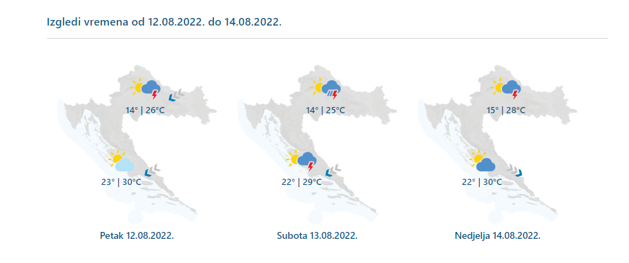 U petak promjenljivo oblačno uz sunčana razdoblja i nestabilno. Mjestimice kiša ili poneki pljusak s grmljavinom izgledniji su popodne na zapadu zemlje. Vjetar slab do umjeren sjeverni i sjeveroistočni. Na Jadranu umjerena do jaka bura s olujnim udarima pod Velebitom, popodne u Dalmaciji sjeverozapadni i jugozapadni vjetar. Jutarnja temperatura od 12 do 17, na Jadranu od 21 do 25 °C. Najviša dnevna od 24 do 28, na Jadranu od 29 do 32 °C.