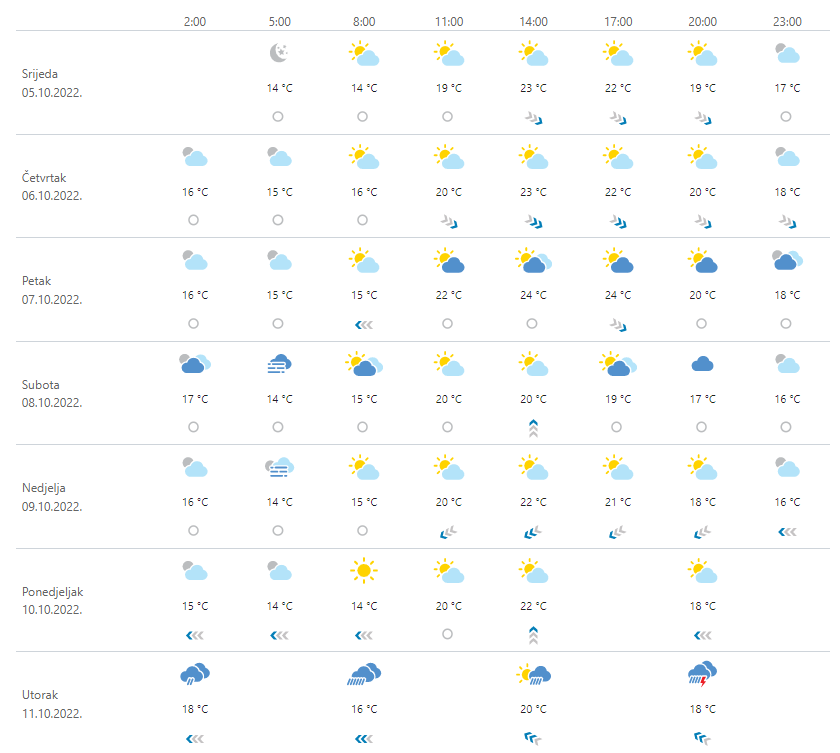 U četvrtak pretežno sunčano, u drugom dijelu dana u Slavoniji i Baranji povremeno umjerena naoblaka. Ujutro će u unutrašnjosti mjestimice biti magle, a moguća je i ponegdje na sjevernom Jadranu. Vjetar uglavnom slab, na moru popodne i umjeren sjeverozapadni i jugozapadni. Najniža jutarnja temperatura zraka između 3 i 8, na moru od 12 do 16, a najviša između 21 i 25 °C.