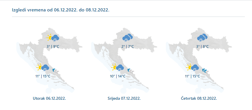U utorak djelomice sunčano, ali ne posvuda suho. Povremena kiša u većini predjela u noći, danju većinom u Dalmaciji, prijepodne i na istoku. Vjetar na kopnu slab. Na sjevernom Jadranu slaba do umjerena bura i sjeverozapadnjak, a u Dalmaciji umjereno jugo. Jutarnja temperatura zraka od 1 do 5, na Jadranu između 9 i 13. Najviša dnevna od 6 do 11, na Jadranu između 13 i 17 °C.