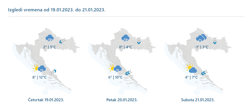 Umjereno i pretežno oblačno uz povremenu kišu, na kopnu i snijeg, vjerojatniji u petak i subotu uz jače zahladnjenje. Susnježice i snijega može biti i na Jadranu, osobito na sjevernom dijelu te u Istri. U četvrtak će na kopnu zapuhati umjeren sjeverni i sjeveroistočni vjetar, na sjevernom Jadranu jaka bura, dok će se u Dalmaciji zadržati jugozapadnjak. U petak će vjetar jačati, osobito u gorju, a bura će se sa sjevernog Jadrana postupno proširiti i na Dalmaciju te će u subotu biti jaka i olujna. Temperatura zraka u postupnom padu.