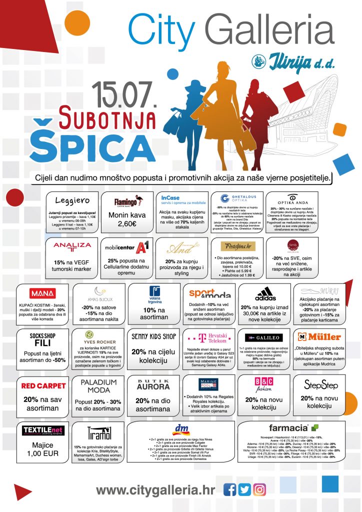 Novu, ljetnu „SUBOTNJU ŠPICU” sa mnoštvom promotivnih akcija, popusta i SEZONSKIH SNIŽENJA pronađite ovu subotu, 15.07. u centru City Galleria.