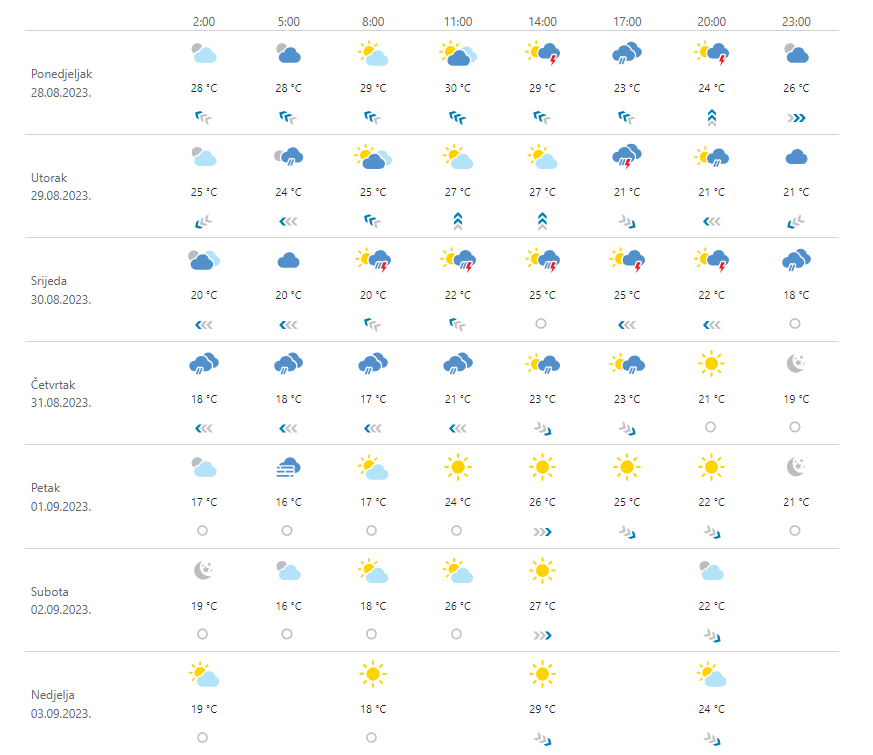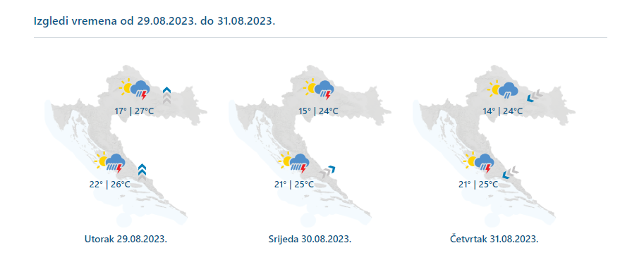 Danas jače naoblačenje s kišom, pljuskovima i grmljavinom zahvatit će već u noći i ujutro sjeverni i dio srednjeg Jadrana, potom će se širiti prema jugu te na zapadne kopnene predjele, a najkasnije, tek kasno popodne, doći će do Slavonije. Pritom je moguće i jače grmljavinsko nevrijeme, vjerojatnije duž obale. Vjetar slab i umjeren južni i jugozapadni, u sjevernim kopnenim krajevima kratkotrajno i sjeveroistočni. Na Jadranu umjereno i jako jugo i jugozapadnjak. Najniža jutarnja temperatura od 16 do 21, na Jadranu od 23 do 27. Najviša dnevna većinom od 27 do 32, u Slavoniji i unutrašnjosti Dalmacije do 36 °C.