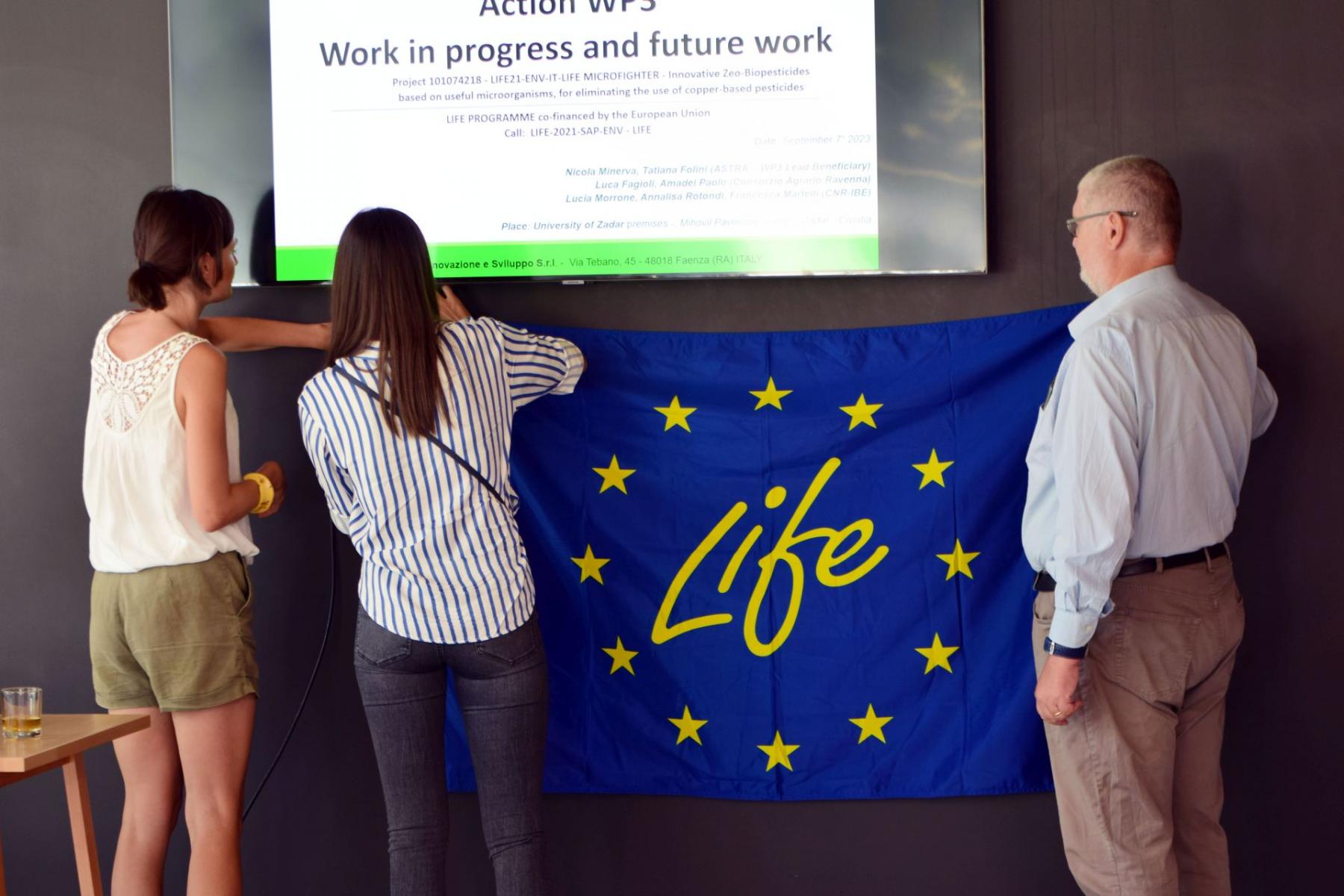 S ciljem prezentiranja preliminarnih rezultata svi projektni partneri okupili su se na redovitom sastanku 7. rujna, 2023. kako bi raspravili o rezultatima i iskustvima nakon provedbe prve godine istraživanja. Sastanak je održan na Sveučilištu u Zadru, prema planu organiziran je posjet Sveučilišnom dobru u Baštici, zatim je nakon pozdravnih govora voditelja projekta i domaćina održano niz predavanja u dvorani „Diadora“ u novom studentskom domu. Teme predavanja bile su o provedbi i prikupljenim rezultatima iz poljskih pokusa, okolišnim analizama osobito klime i tla, postojanosti pripravka na listu i održivosti pripravka kroz vrijeme, te tehničkim, diseminacijskim i organizacijskim aktivnostima koje partneri provode ili trebaju provesti.