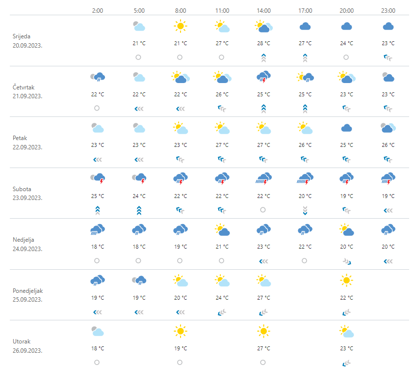 U četvrtak promjenjivo oblačno sa sunčanim razdobljima i nestabilno. Uz jači razvoj oblaka lokalni pljuskovi praćeni grmljavinom mjestimice mogu biti izraženiji, osobito na sjevernom i srednjem Jadranu te u unutrašnjosti Dalmacije. Puhat će uglavnom umjeren južni i jugozapadni vjetar, na istoku i jugoistočni. Na Jadranu umjereno do jako jugo i jugozapadnjak, a na jugu navečer moguće i bura. Najniža temperatura između 14 i 17, na Jadranu od 18 do 23 °C. Najviša dnevna većinom između 25 i 29 °C.