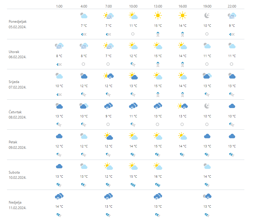 Danas razmjerno toplo za doba godine i u većini krajeva bar djelomice sunčano. Ujutro mjestimice magla, prijepodne prolazno oblačnije, na sjevernom Jadranu niska naoblaka mogla bi se zadržavati veći dio dana. Vjetar slab i umjeren jugozapadni i zapadni, na istoku zemlje i sjeverozapadni, a duž obale ponegdje jugoistočni. Najviša dnevna temperatura zraka između 14 i 19 °C.