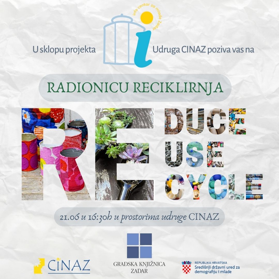 U sklopu projekta Info centar za mlade Zadar, Udruga CINAZ poziva sve zainteresirane na kreativnu radionicu upcyclinga, koja će se održati 21. lipnja u 16:30 sati u prostorijama udruge CINAZ na adresi Andrije Medulića 2.