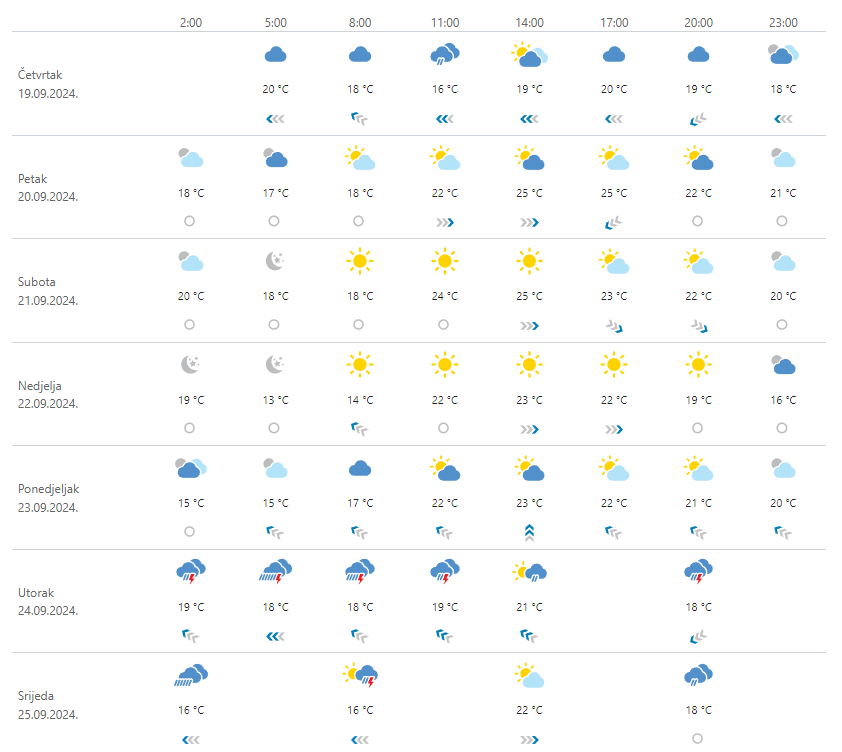 Djelomice, za vikend i pretežno sunčano, osobito u nedjelju. Još u petak uz promjenjivu naoblaku mjestimice malo kiše ili poneki pljusak, a uz lokalno jači razvoj oblaka ponekog kratkotrajnog pljuska može biti i u dane vikenda, uglavnom na Jadranu i u predjelima uz njega. U subotu i nedjelju ujutro ponegdje moguća magla. Vjetar slab, još u petak do umjeren sjeveroistočni. Na Jadranu umjerena i jaka bura tijekom petka u slabljenju, u subotu danju mjestimice umjeren sjeverozapadnjak, a u nedjelju vjetar većinom slab. Temperatura zraka bez veće promjene.