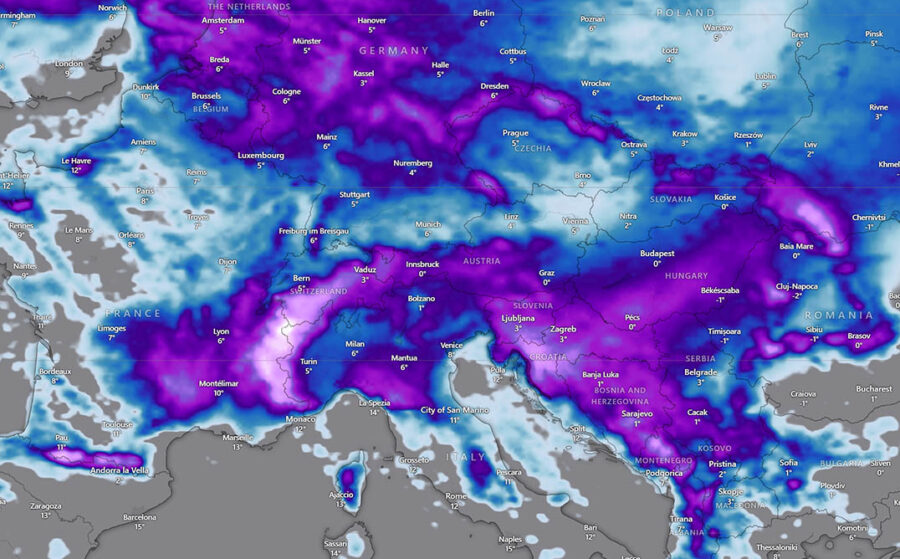 Preko noći će preko Alpa padati jak snijeg, a moguća je i dinamička planinska kiša u zemljama sjeverozapadnog Balkana.
