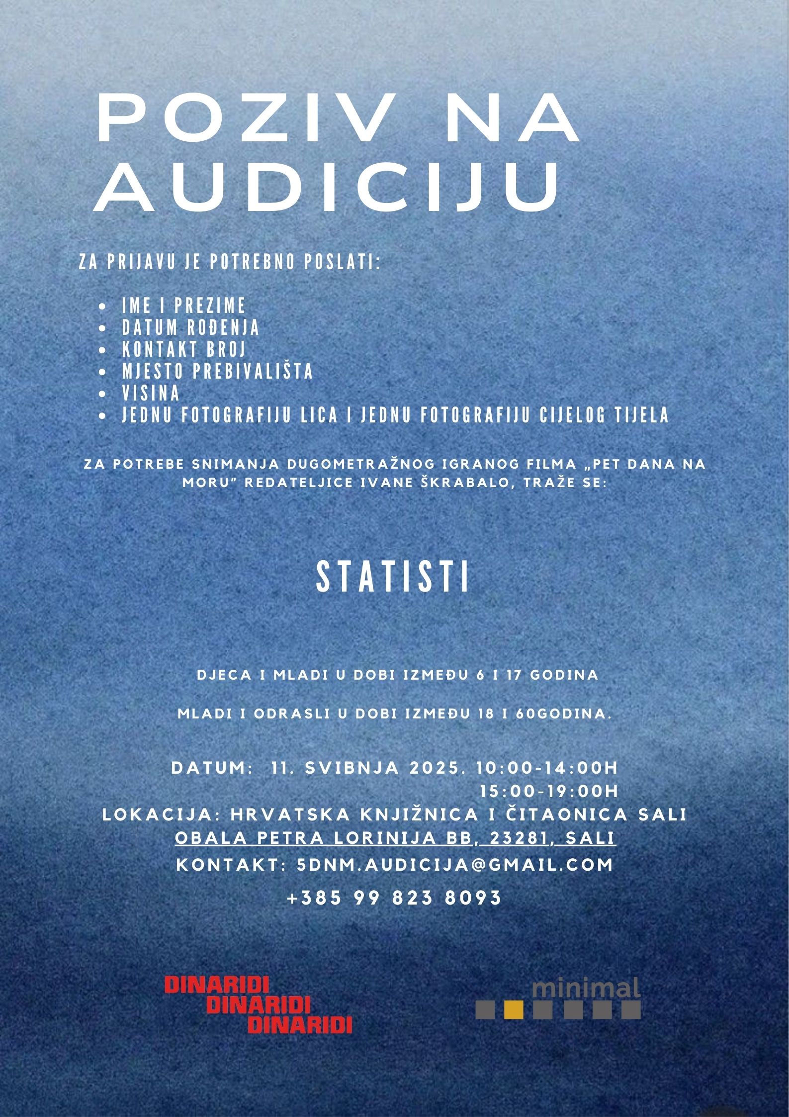 Filmski ured Ustanove INOVacija za potrebe snimanja dugometražnog igranog filma „5 dana na moru“ redateljice Ivane Škrabalo, poziva sve zainetersirane da se prijave za statiste. Traže se:
