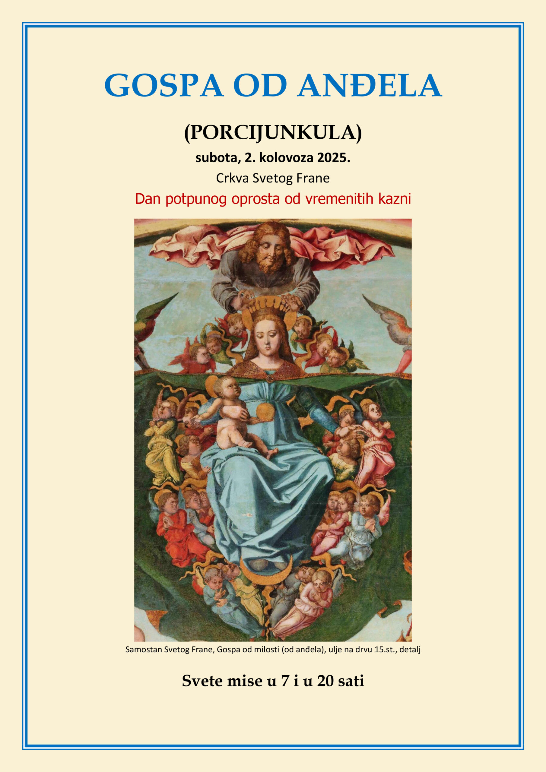 U crkvi Svetog Frane u Zadru svake godine tradicionalno se već stoljećima slavi Svetkovina Blažene Djevice Marije Anđeoske (Porcijunkula). Dan Porcijunkulskog oprosta ove godine pada u subotu i bit će slavljen svetim misama u 7 i u 20 sati.