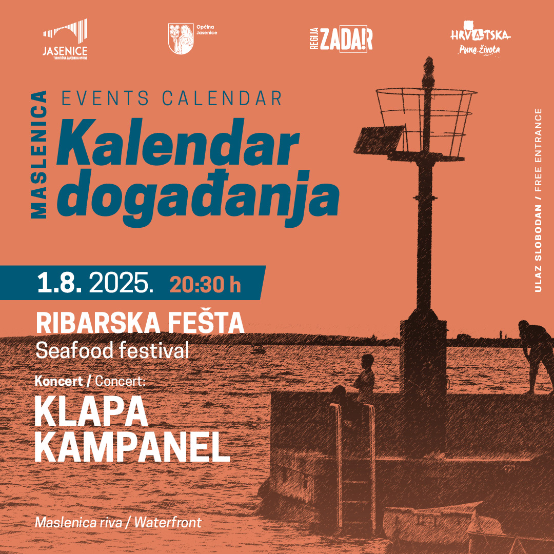 U petak 1. kolovoza 2025. s početkom u 20:30 sati na masleničkoj rivi pridružite se “Ribarskoj večeri” i koncertu popularne klape Kampanel.