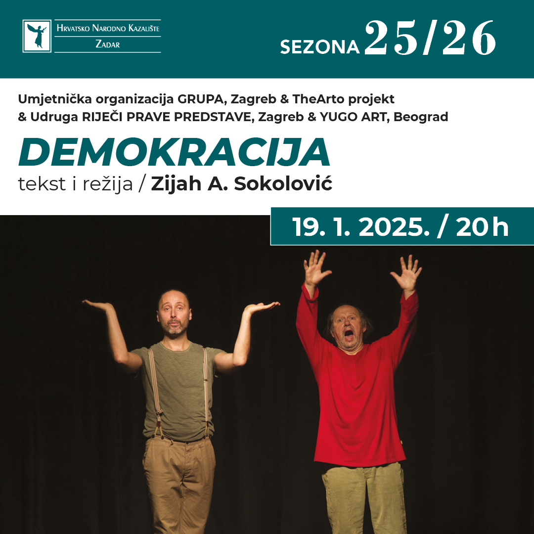 U ponedjeljak, 19. siječnja u 20 sati, na sceni HNK Zadar publiku očekuje višestruko nagrađivana satirična komedija DEMOKRACIJA, autora i glumca Zijaha A. Sokolovića. U predstavi igraju Dražen Šivak i Zijah A. Sokolović.
