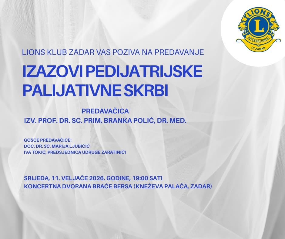 Predavanjem „Izazovi pedijatrijske palijativne skrbi“, zadarski Lions klub pokreće inicijativu za formiranje mobilnog palijativnog tima za djecu s teškim i kroničnim bolestima na području Zadarske županije. Predavanje je zakazano za srijedu, 11. veljače u Koncertnoj dvorani Braće Bersa s početkom u 19 sati. Održat će ga izv.prof.dr.sc.prim. Branka Polić, dr.med., specijalistica pedijatrije i subspecijalistica intenzivne medicine, pročelnica Zavoda za intenzivnu pedijatriju s postintenzivnom skrbi KBC-a Split i sama članica velike Lions organizacije.
