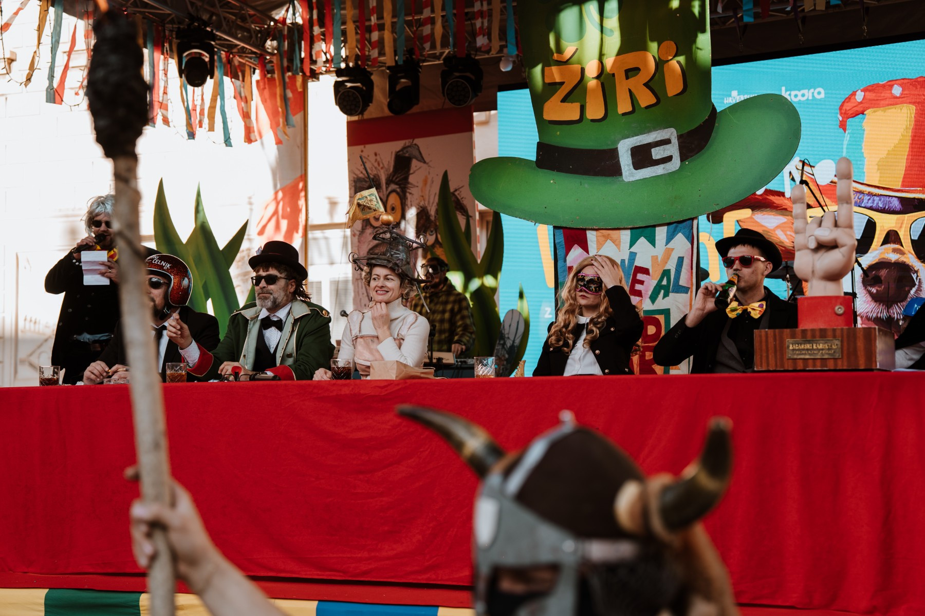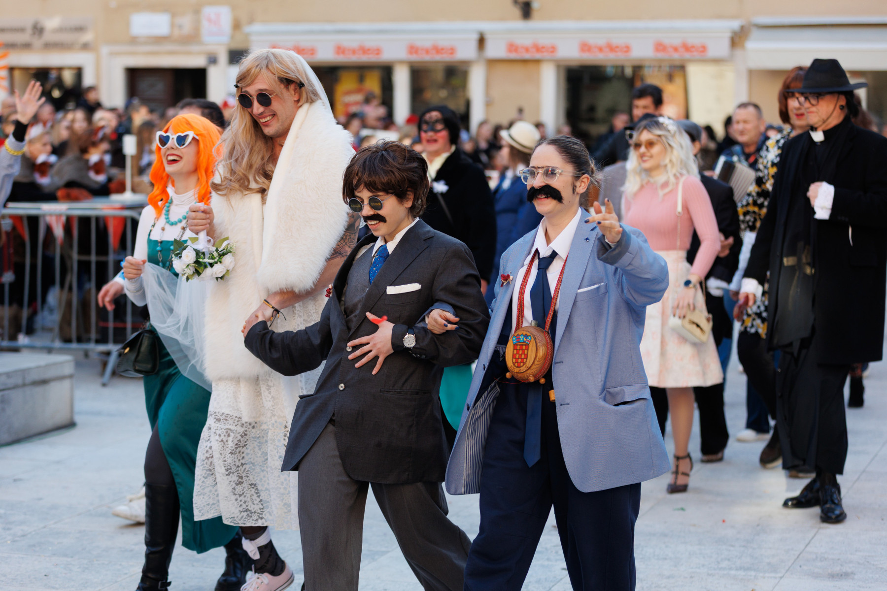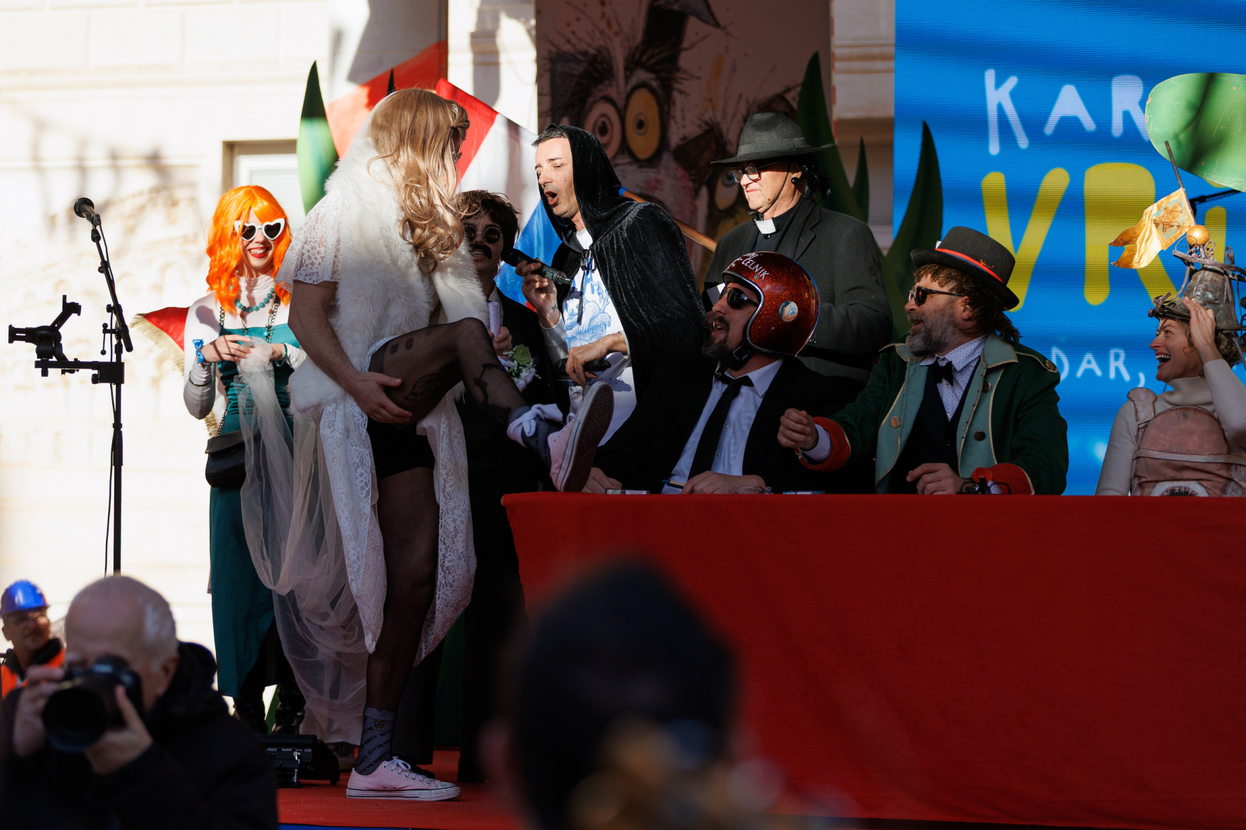 Na pozornici pred zgradom vijećnice palo je i prvo vjenčanje veselih svatova sa Stanova koji su sa sobom doveli svećenika, ali i Maju Šuput koja zvuči bolje nego prava. Pravi show napravila je ekipa iz Vrsi čije je Vrime munještine donijelo i vrške štrige i božicu mora, ali i cijeli pub koji se otvara kraj crkve. Sa stolovima i ekipom koja na njima igra na karte. Doveli su čak i svog meštra tako da je čak i Štorić mogao malo predahnuti. Nakon zombija iz KUD-a Mrtovnjak i Škure tramontane, povorku su zaokružile maškare iz Pakoštana koje na trg dovezao rasklimani autobus firme Krstić, naravno uz legendarni zvuk iz filma „Ko to tamo peva”.