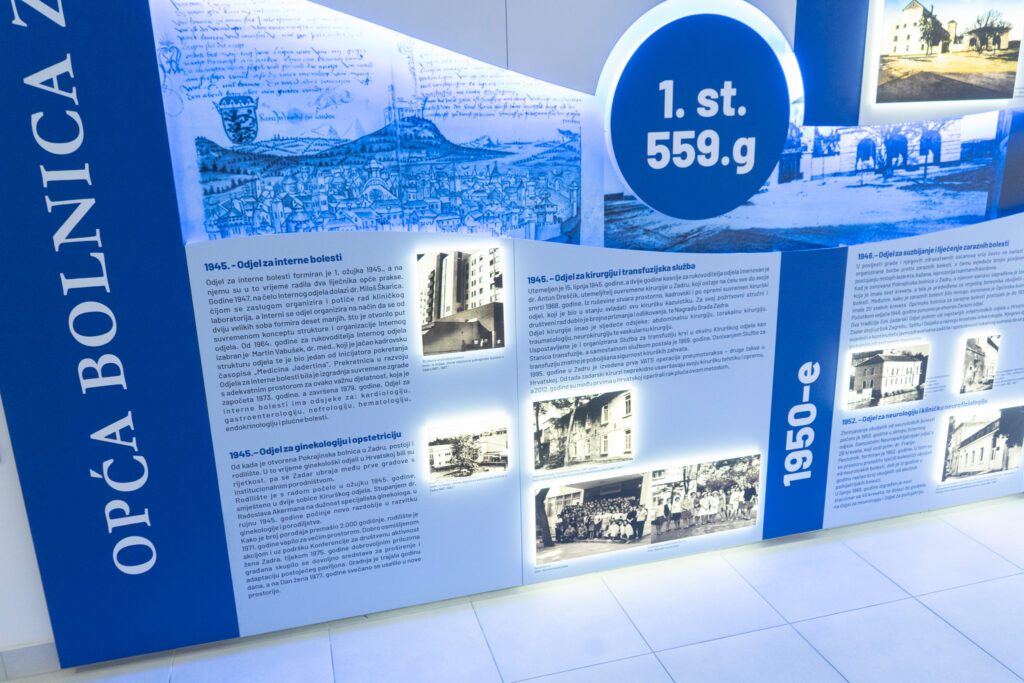 U prostoru Poliklinike Opće bolnice Zadar postavljena je nova instalacija, osmišljena kao pregledna vremenska traka koja prikazuje razvoj zadarskog zdravstva od antike do današnjih dana, s istaknutim najznačajnijim događajima i osobama koje su obilježile njegov napredak. Kroz pažljivo odabrane povijesne točke, dokumente i vizualne elemente, posjetitelju se pruža jasan i sažet uvid u to kako se zdravstvena skrb u Zadru oblikovala, mijenjala i unapređivala kroz stoljeća.