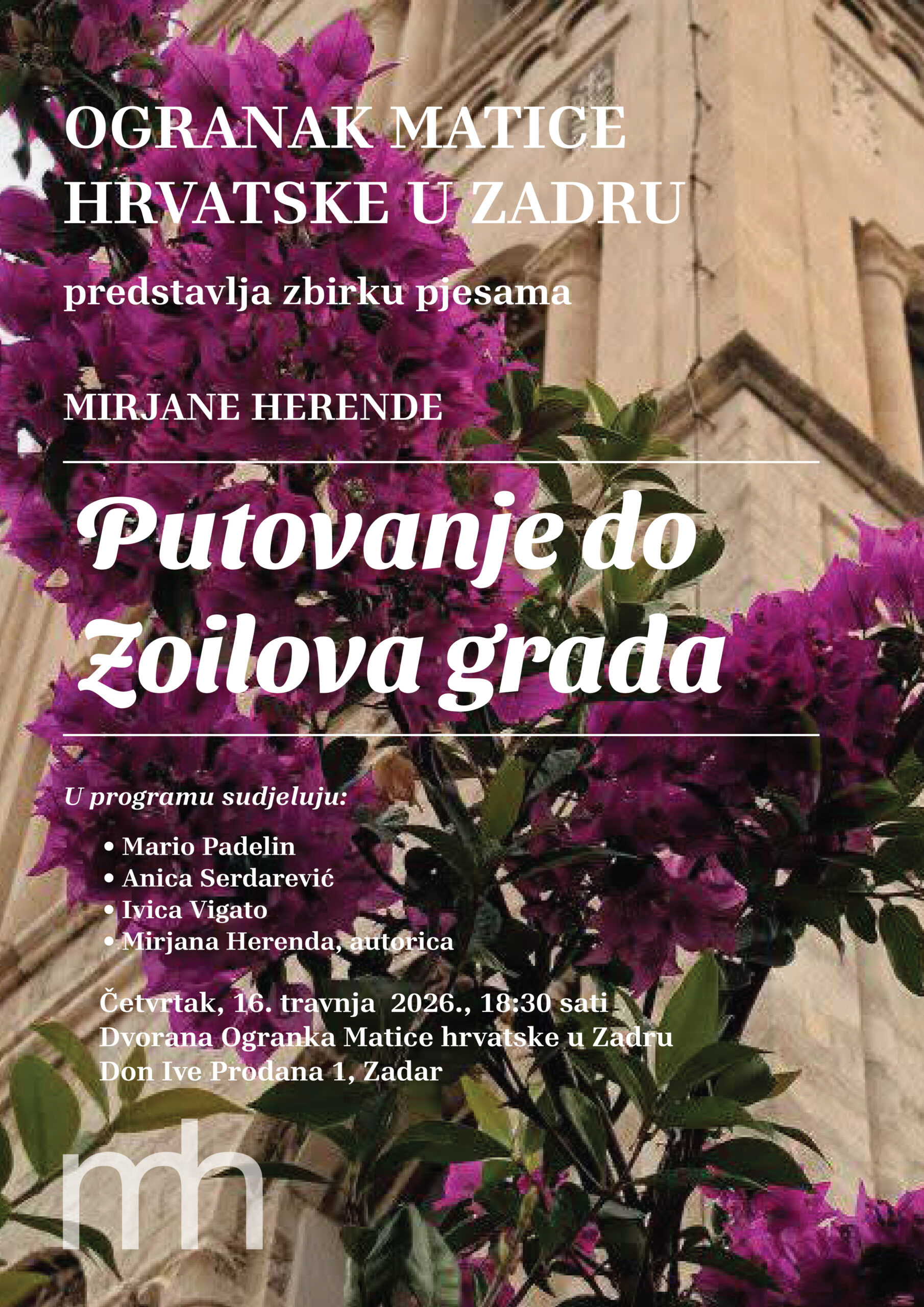 Ogranak Matice hrvatske u Zadru predstavlja novu zbirku zadarske pjesnikinje Mirjane Herende: “Putovanje do Zoilova grada”.