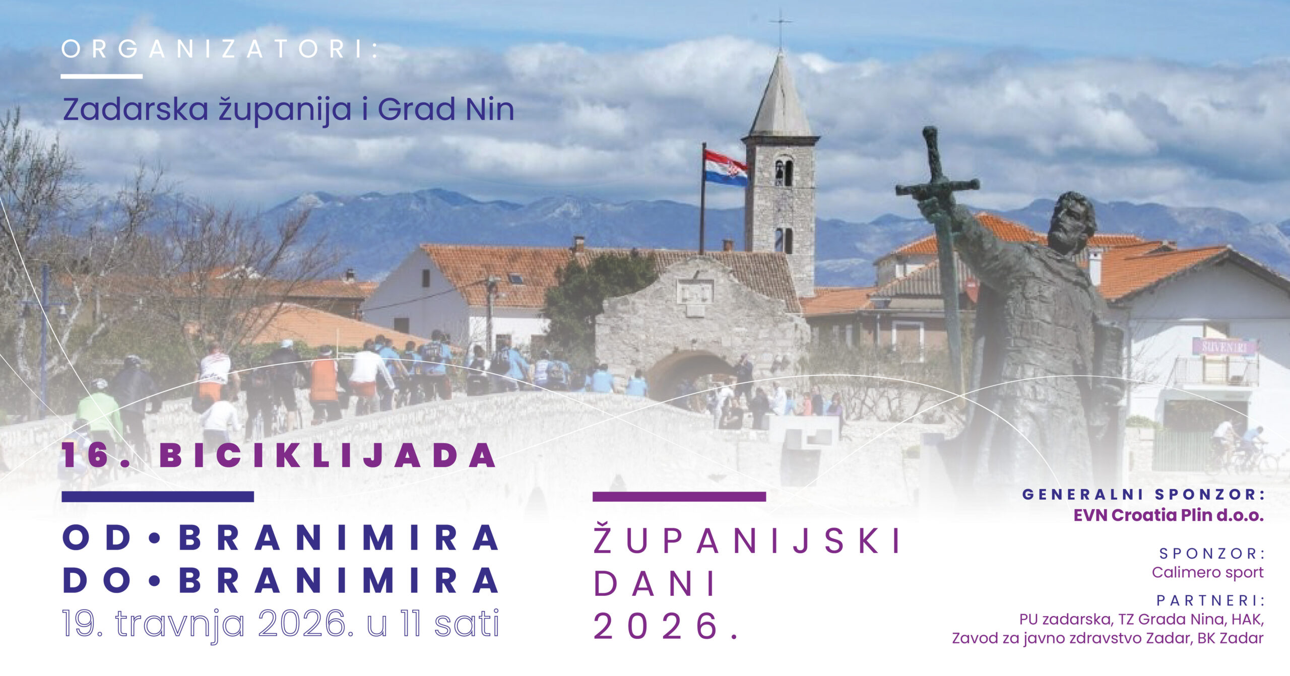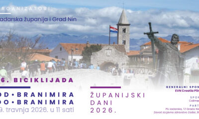 U sklopu obilježavanja Županijskih dana 2026., u nedjelju, 19. travnja, održat će se tradicionalna županijska biciklijada „Od Branimira do Branimira”. Početak biciklijade predviđen je u 11 sati, a sudionici će voziti od Branimirove obale u Zadru do Branimirove obale u Ninu.